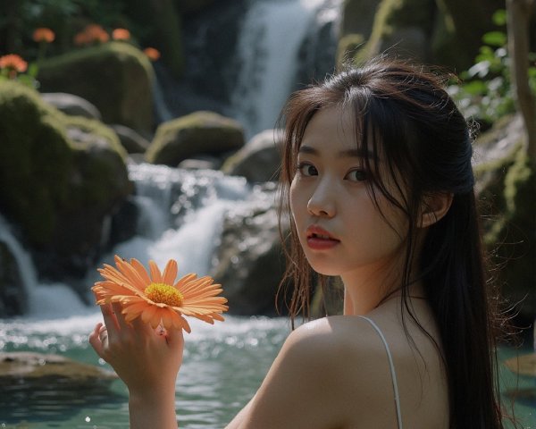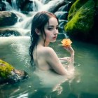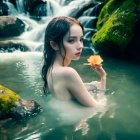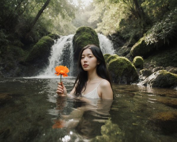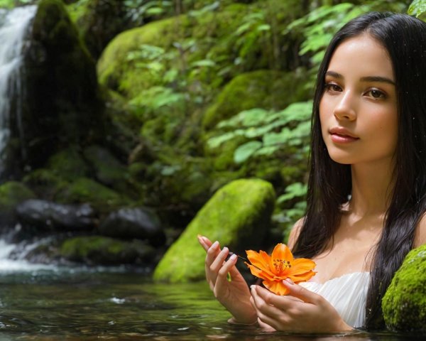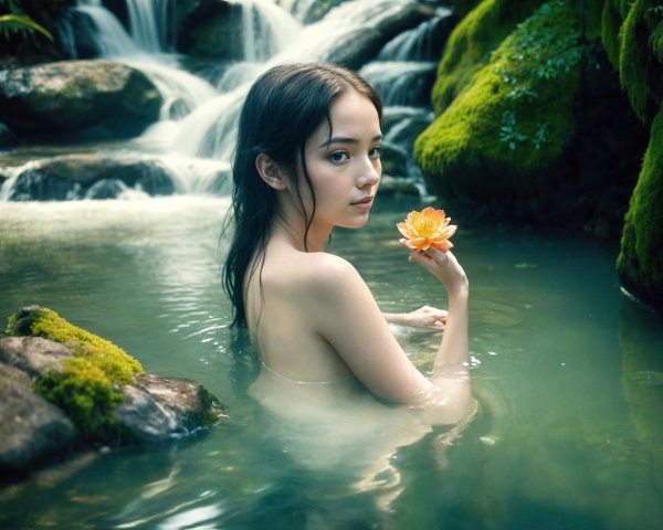 A serene scene depicts a young woman partially submerged in a tranquil, mossy pool, holding a vibrant orange flower. A gentle waterfall cascades in the background, enhancing the natural beauty.