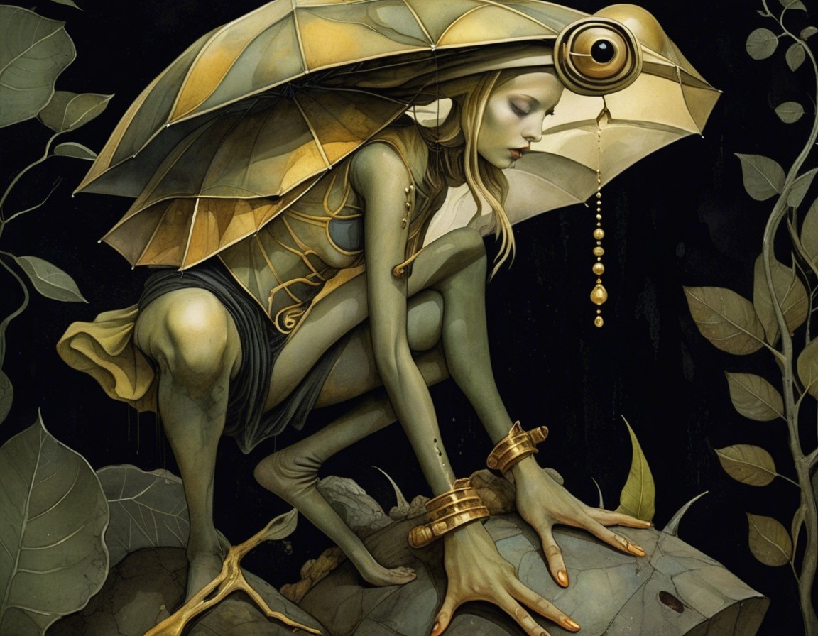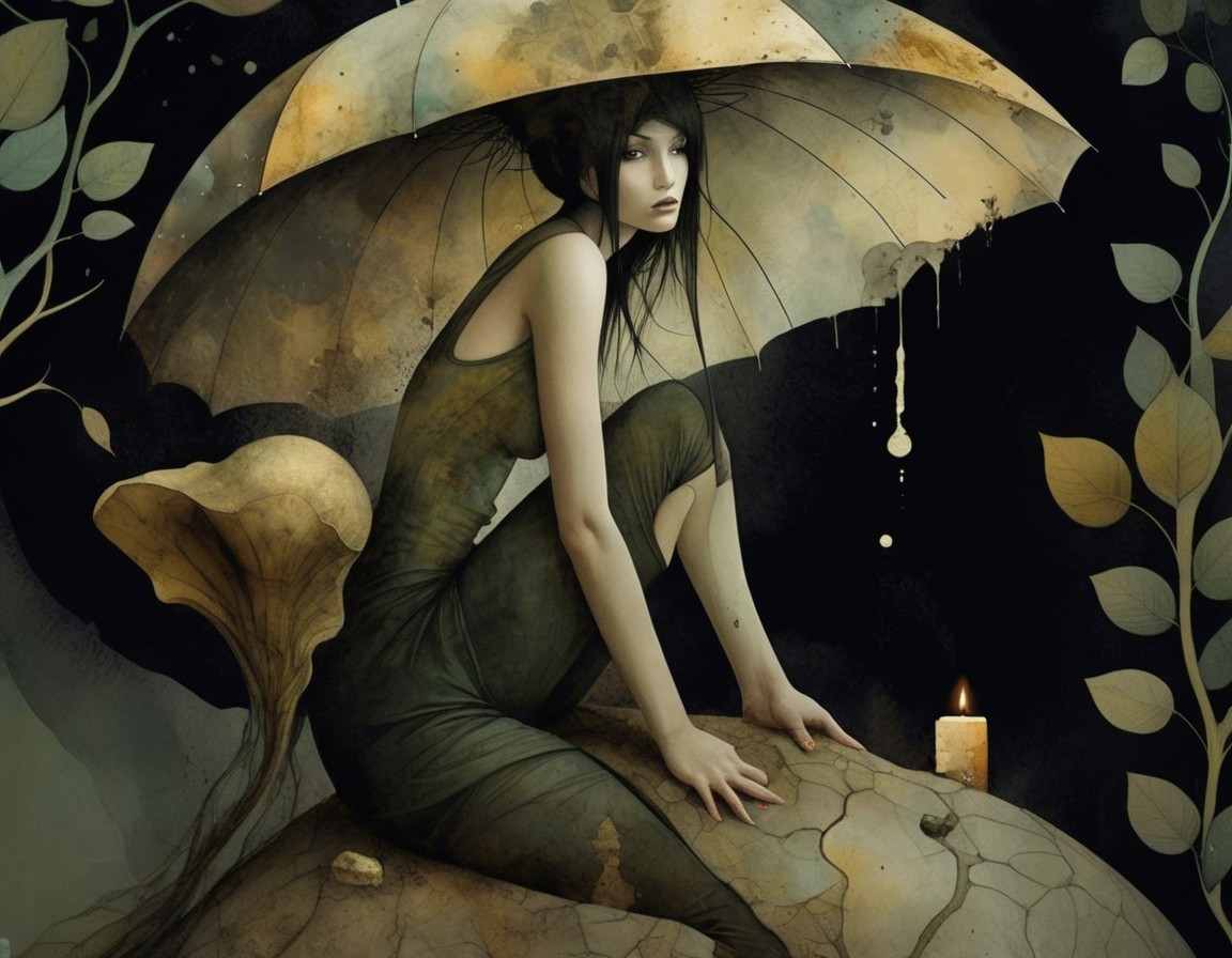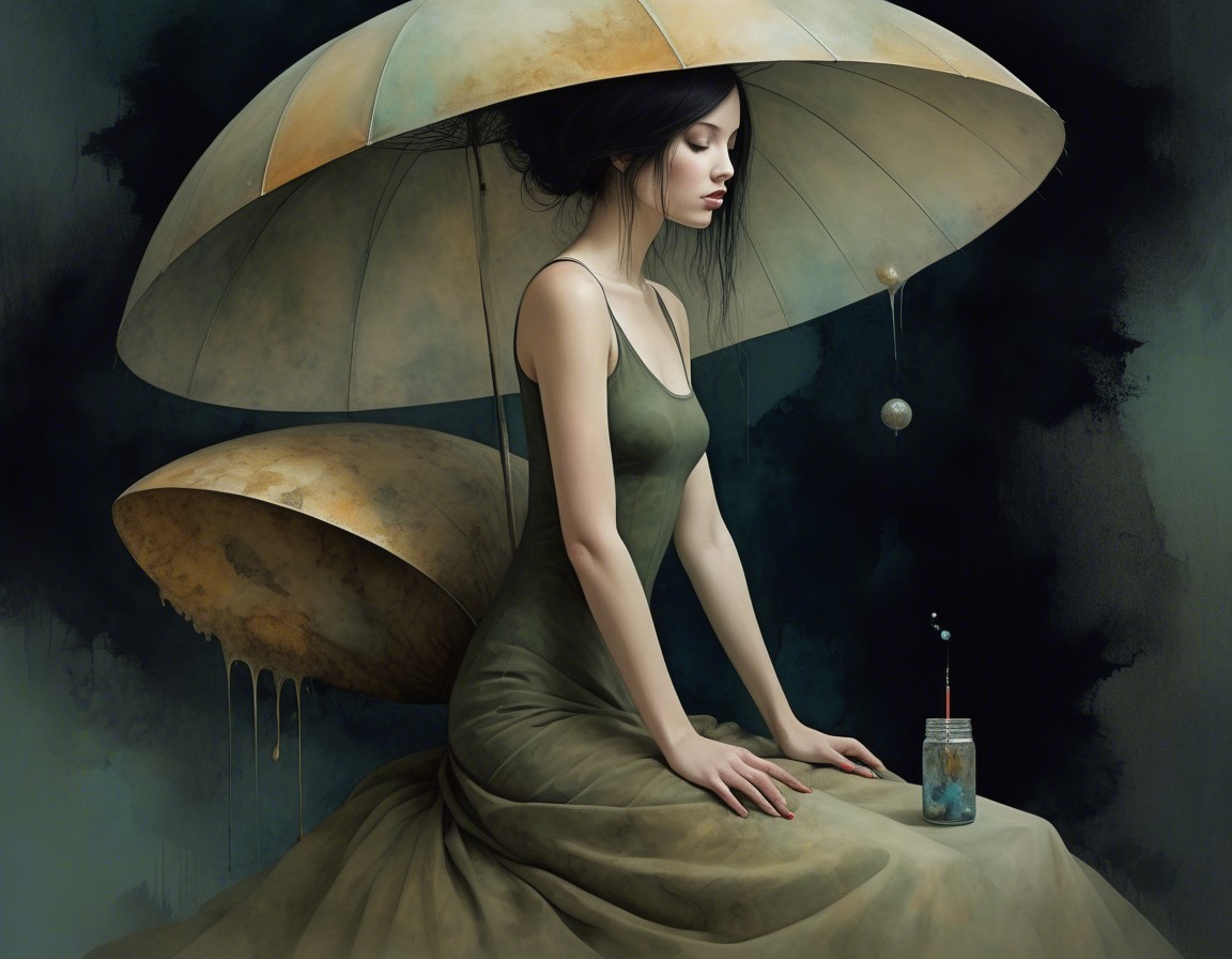 A serene figure with platinum hair sits cross-legged, reading a book. Surrounded by abstract orbs and a muted, dreamlike background with a distant ship, she exudes calm and contemplation.