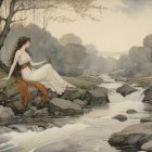 In a serene kitchen with a view, a man cooks at a table while a woman in a red dress sits nearby. Steam rises from a pot, creating a calm and nostalgic atmosphere.