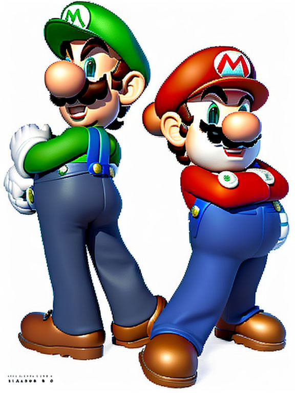 Two animated characters in green and red overalls with crossed arms and caps with initials.