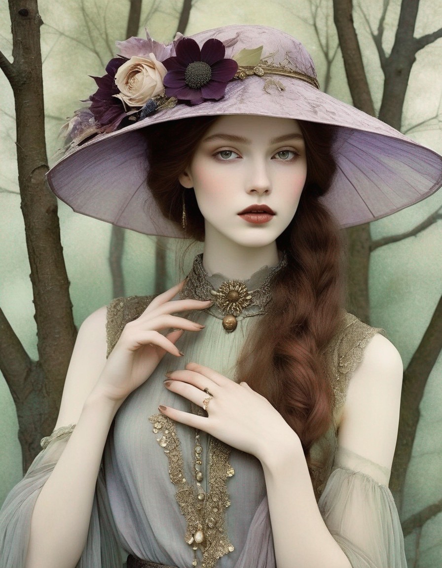 A woman in vintage attire with a floral hat gazes aside under moonlight.