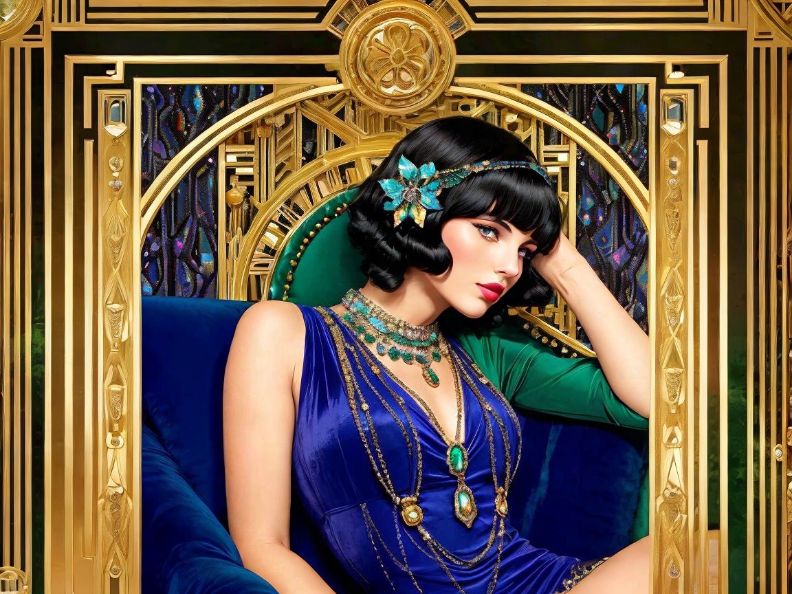 A glamorous woman in a deep blue dress sits elegantly in a golden, art deco setting, adorned with emerald jewelry and a matching headpiece, evoking a vintage 1920s aesthetic.