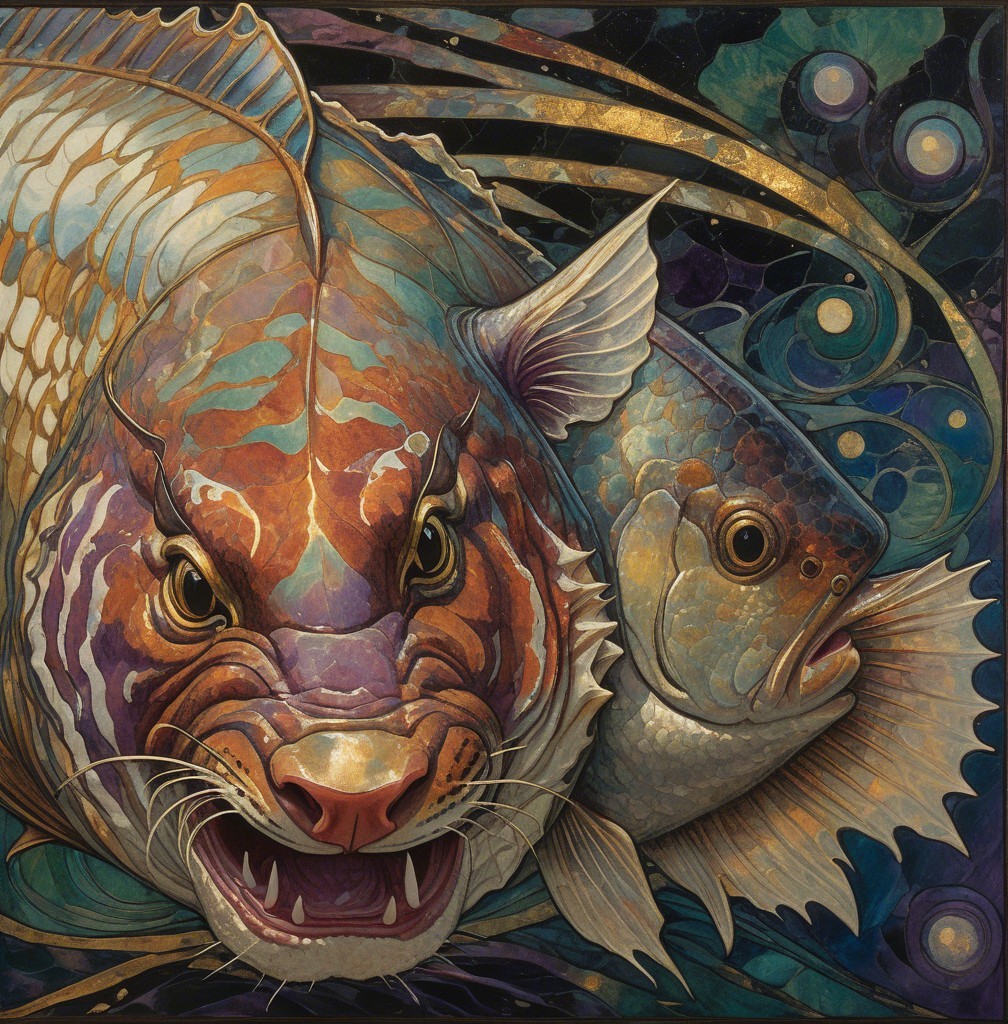 The image features a vividly colored, stylized fish with intricate patterns and textures, set against a rich, abstract background that enhances its vibrant hues and dynamic form.
