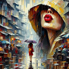 A vibrant, surreal cityscape features abstract houses under a colorful sky. Two figures in silhouettes walk along a reflective street, one holding an umbrella, exuding a dreamlike atmosphere.