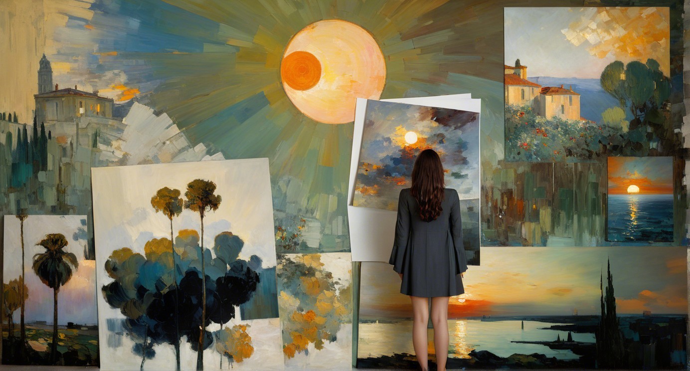 A person stands admiring a vibrant wall filled with various paintings, featuring sunlit landscapes and colorful patterns, evoking a sense of warmth and artistic exploration.