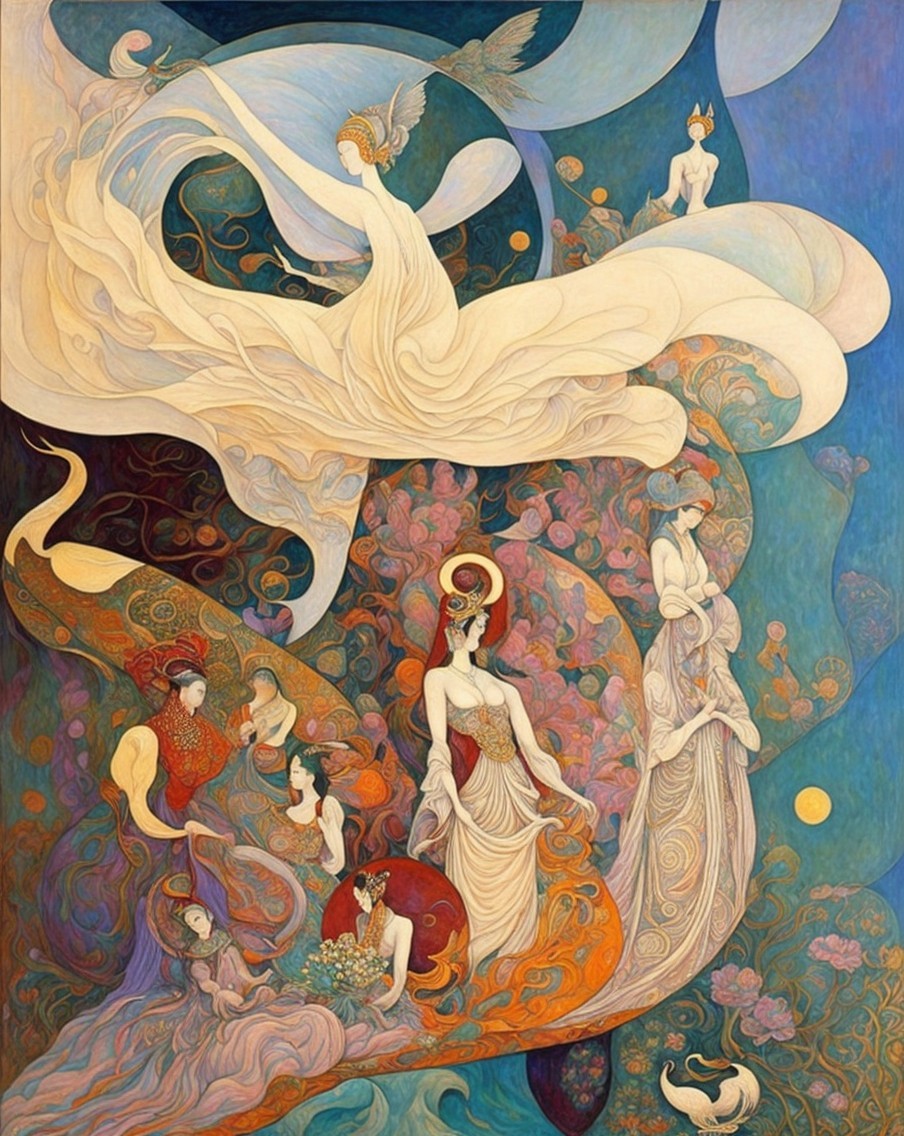 The image features ethereal figures in flowing, ornate dresses, intertwined with vibrant swirling patterns and cosmic elements, creating a dreamlike, whimsical atmosphere. Colors blend harmoniously.