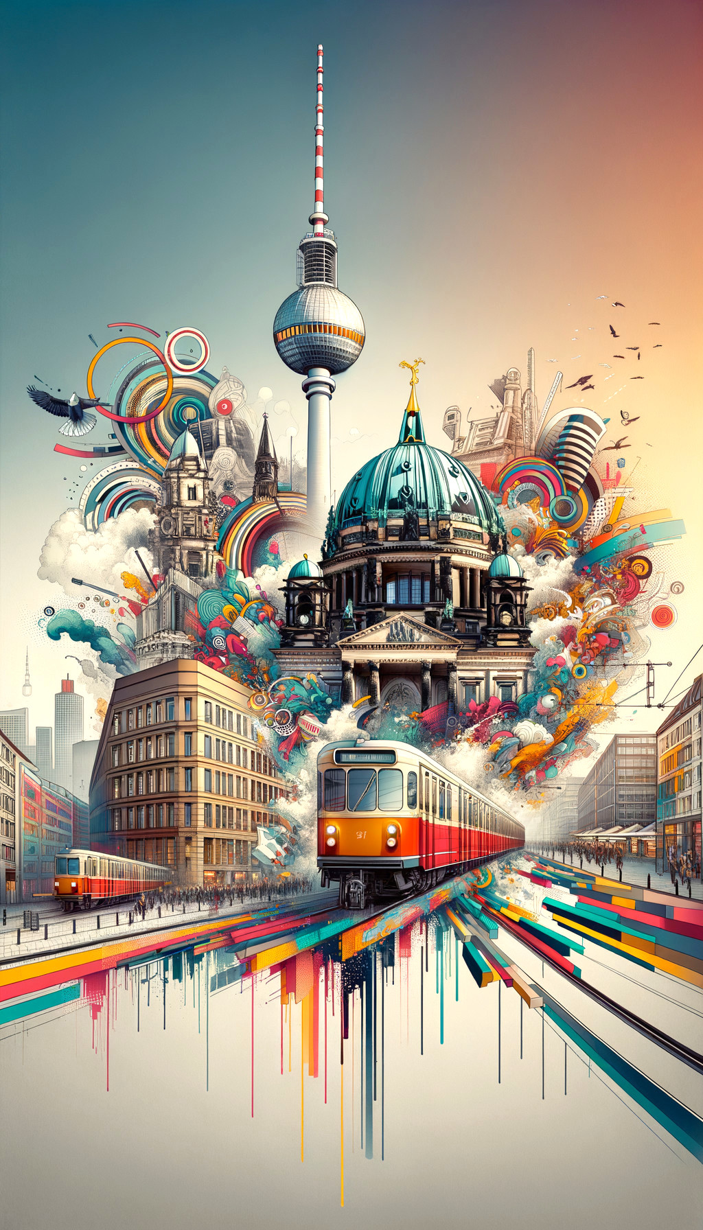 An artistic, vibrant cityscape with iconic buildings, a train, and colorful abstract elements flowing into the sky.