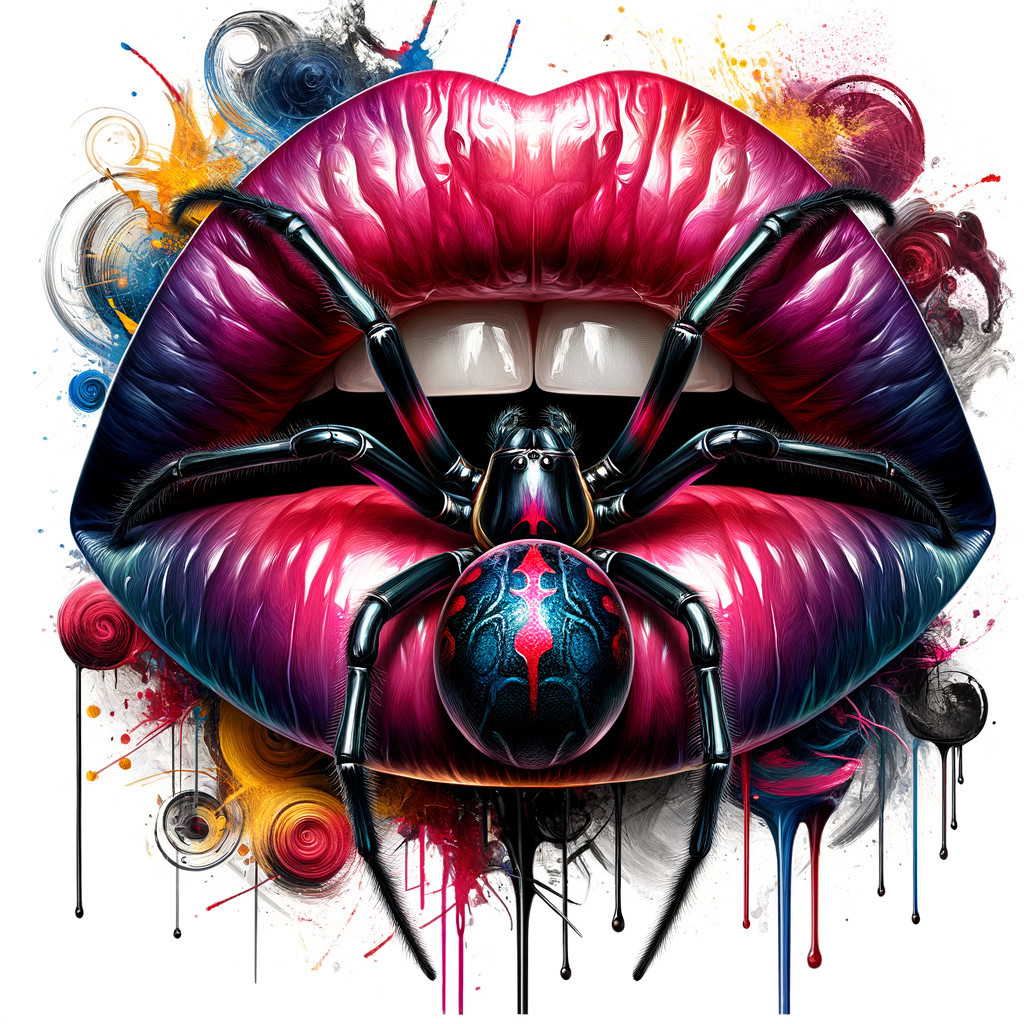 A striking close-up of vibrant, glossy lips in shades of pink and purple, adorned by a black spider perched on the lower lip. The background features abstract swirls and drips of paint, creating a surreal effect.