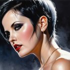 A striking, stylized portrait of a woman with short hair, featuring bold makeup and a dramatic expression. Splashes of red paint create a dynamic background, enhancing her fierce allure.
