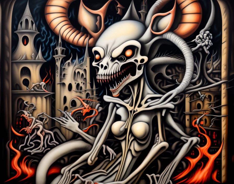 A vivid, surreal artwork of a skeletal figure with many orange tentacles, red eyes, against a backdrop of gothic architecture.