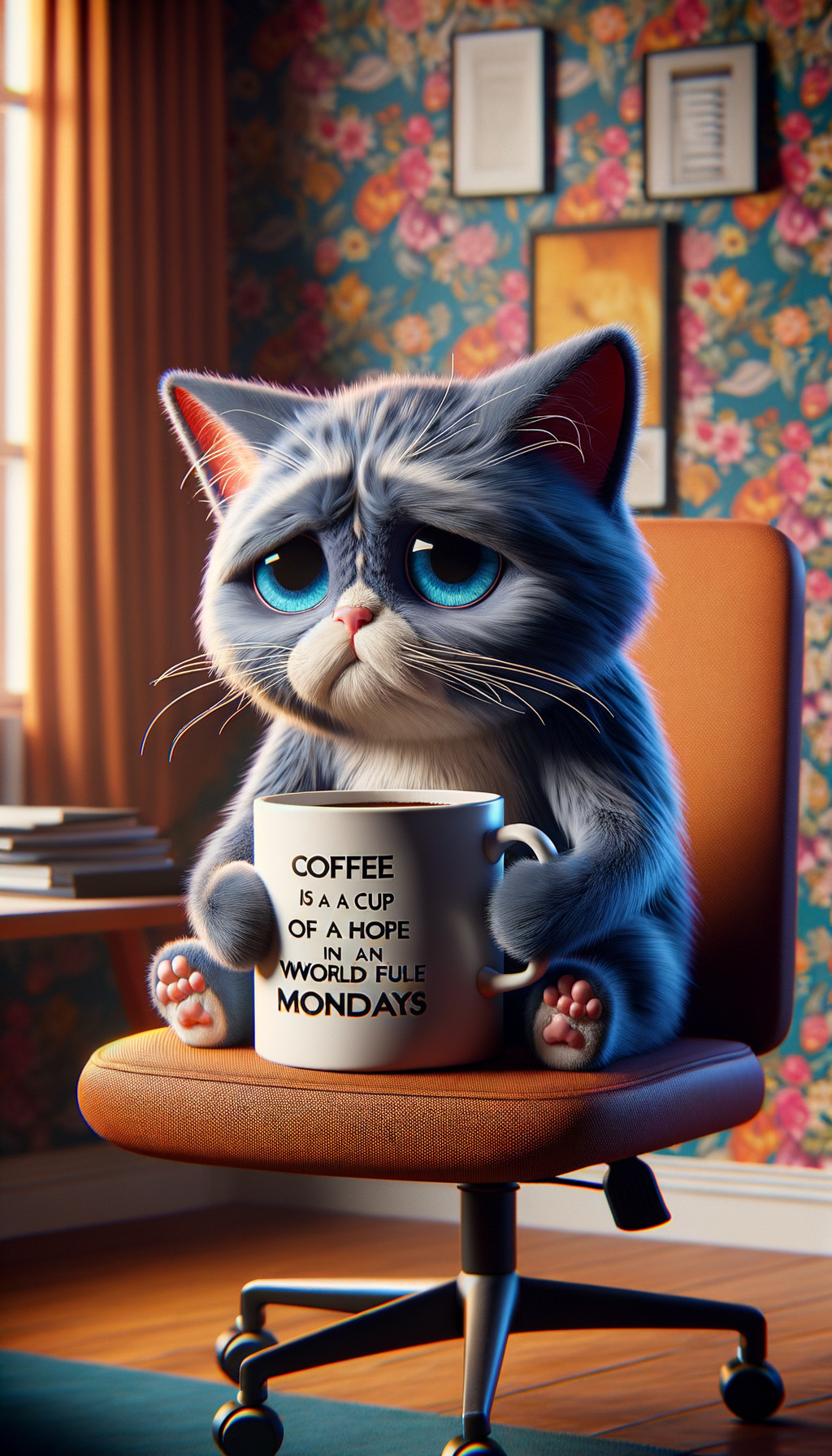An anthropomorphic grey cat with striking blue eyes sits in a chair, holding a coffee mug, in a cozy, colorful room.