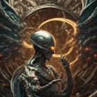A serene profile of a young woman adorned with ornate wings and a celestial background, blending intricate patterns and cosmic colors, evoking a sense of ethereal beauty and tranquility.
