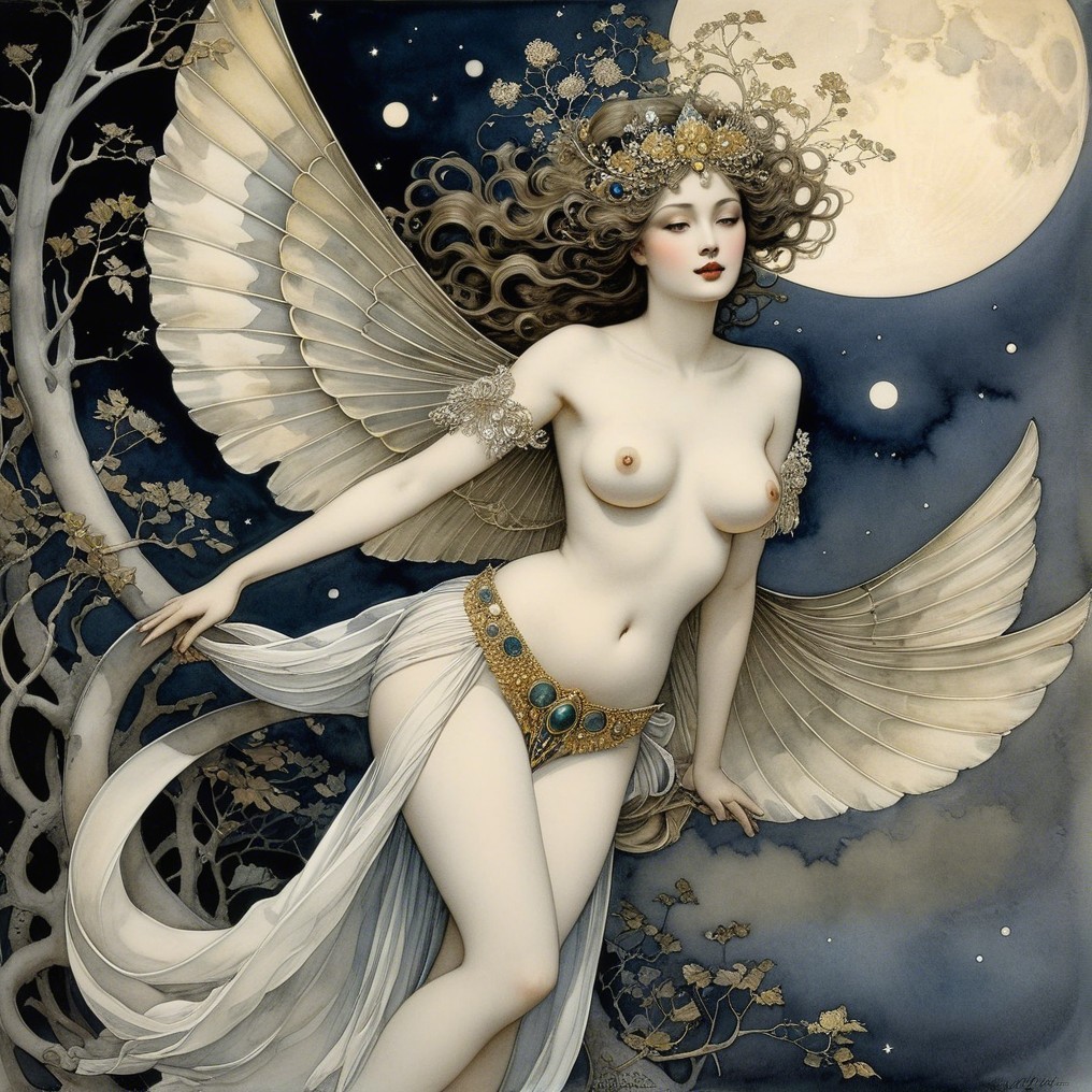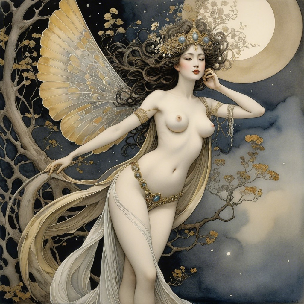 A mystical figure dances gracefully under a full moon, adorned in ornate golden jewelry. Her flowing hair and ethereal gown blend with the serene night, embodying beauty and enchantment.