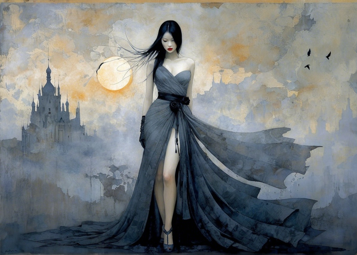 A mysterious figure in a flowing black dress and wide-brimmed hat stands against a backdrop of dark, stylized architecture. The artwork blends elegance with an air of intrigue.