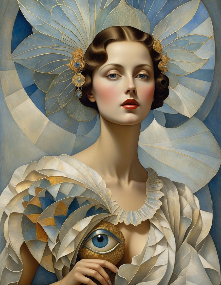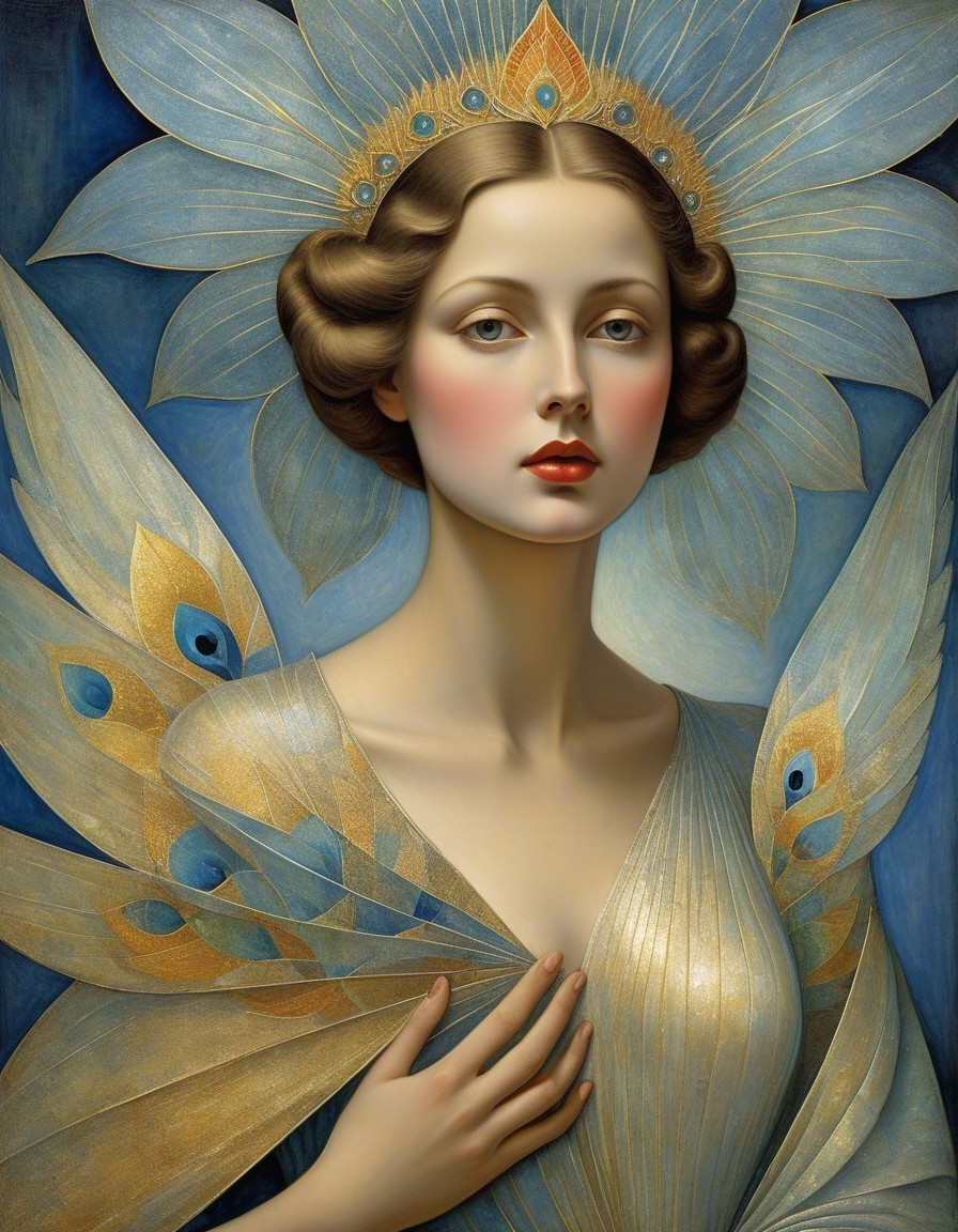 A single image, art nouveau siren, style of Alex Grey, style of Remedios Varo, style of Paul Klee, style of Leonora Carrington, eye contact, soft, beautiful delicate interplay of light and shadows on every surface, exotic, vivid, radiant, kaleidoscopic, highly colorful, most complex and highly intricate, dominant golden and indigo but colors, highly intricate and utterly complex designs and patterns, exciting. Prompt by Vishrut Abhinna.