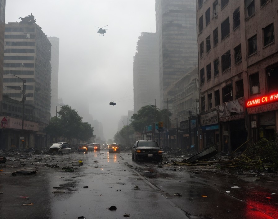 A gloomy cityscape with damaged buildings, debris on the street, and a helicopter flying amidst overcast skies.