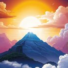 A serene landscape features a majestic mountain with a pyramid-like peak under a vibrant sunset. Soft clouds surround the scene, enhancing the tranquil atmosphere of this mystical setting.