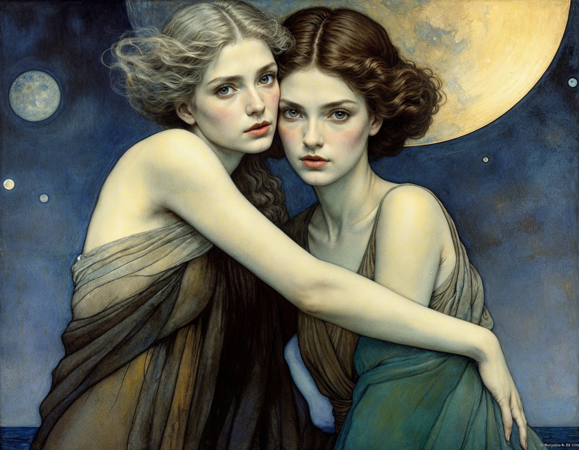 Two women embrace under a full moon, their flowing hair styled with soft waves. They wear elegant draped garments, exuding a sense of intimacy and mystique against a dark sky backdrop.