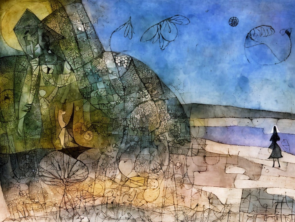 A whimsical scene shows a solitary figure walking along a beach beneath a vast blue sky. In the background, a quaint village sits atop a textured cliff, with a shimmering coastline nearby.