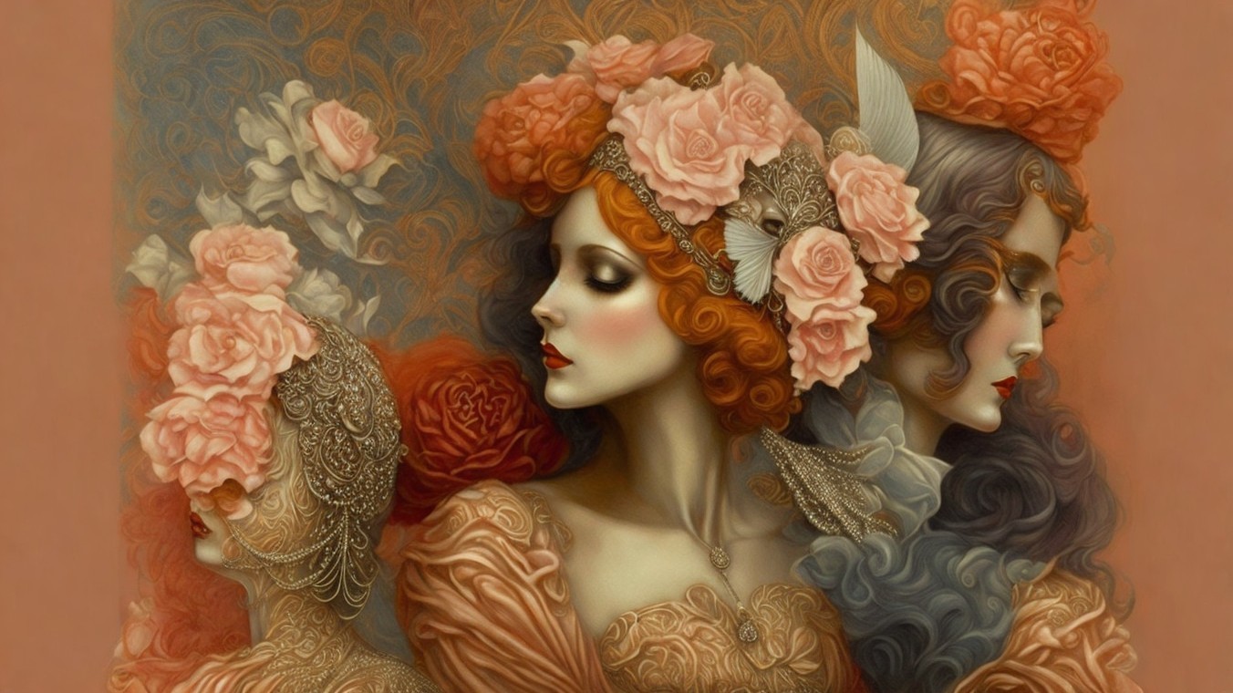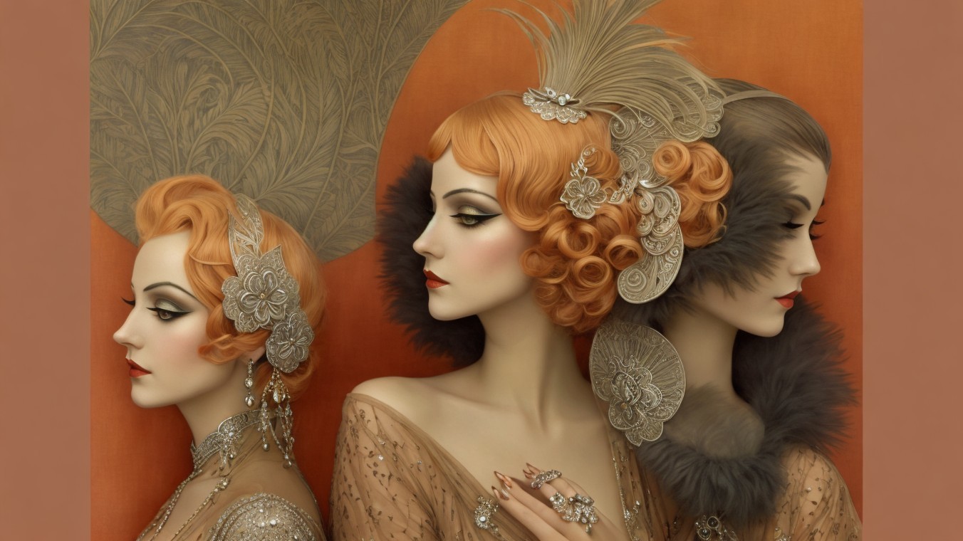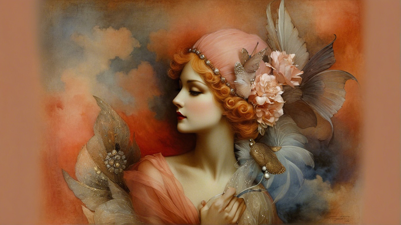 A glamorous woman with elegant makeup and intricate jewelry holds a bird gently. Her hairstyle features feathers, set against a richly patterned red background, conveying a sense of luxury and grace.