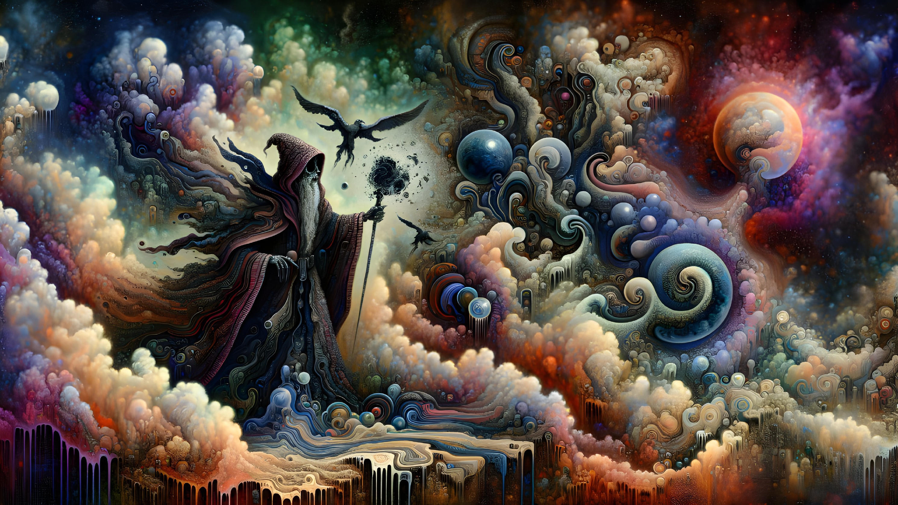 A mystical dark figure in a flowing cloak stands among vibrant, daark swirling clouds and celestial orbs, wielding a staff. Dark birds soar through the colorful yet shadeful scene, evoking a sense of dark magic and dredful wonders.