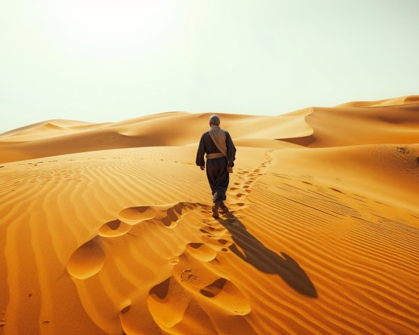 A figure in traditional attire walks alone through an expansive desert landscape of golden sand dunes, under a hazy sky. The solitude and vastness evoke a sense of journey and exploration.