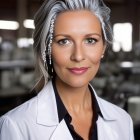 A glamorous figure with stylish, vibrant sunglasses and a trendy hair accessory. She wears a chic blazer and has a bold lip color, exuding confidence and a modern aesthetic in a trendy setting.