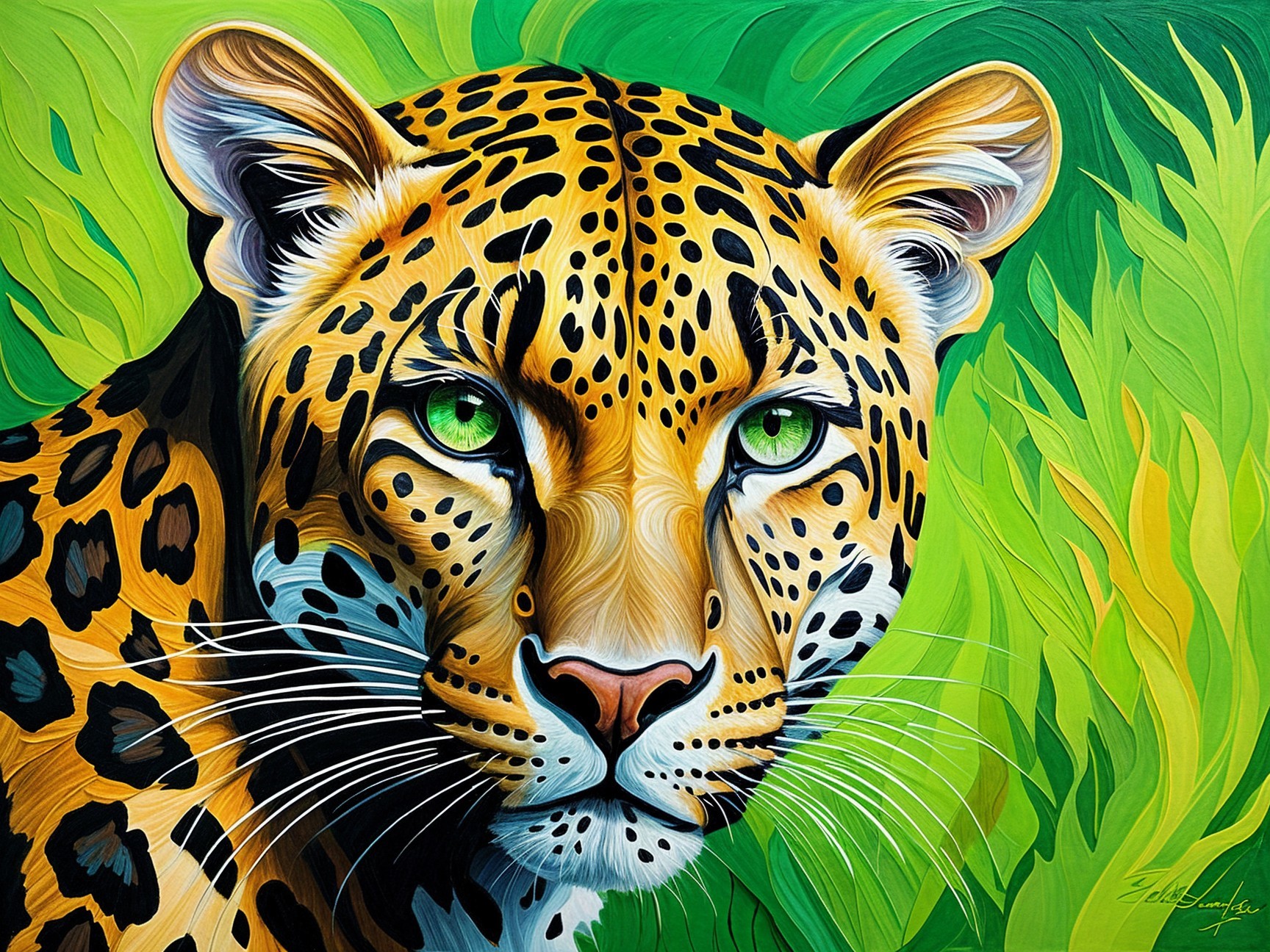 Colourful painting of a leopard with striking green eyes and a patterned golden coat. The background features lush green hues, enhancing the leopard's fierce expression.