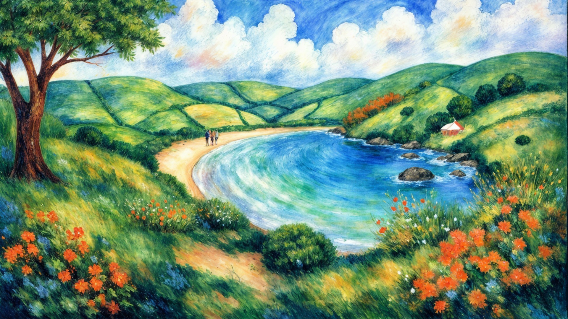 A serene beach scene with soft waves lapping at a sandy shore. Colorful flowers and lush greenery frame the coast, while a charming red-roofed house and people enjoying the sun add life to the landscape.