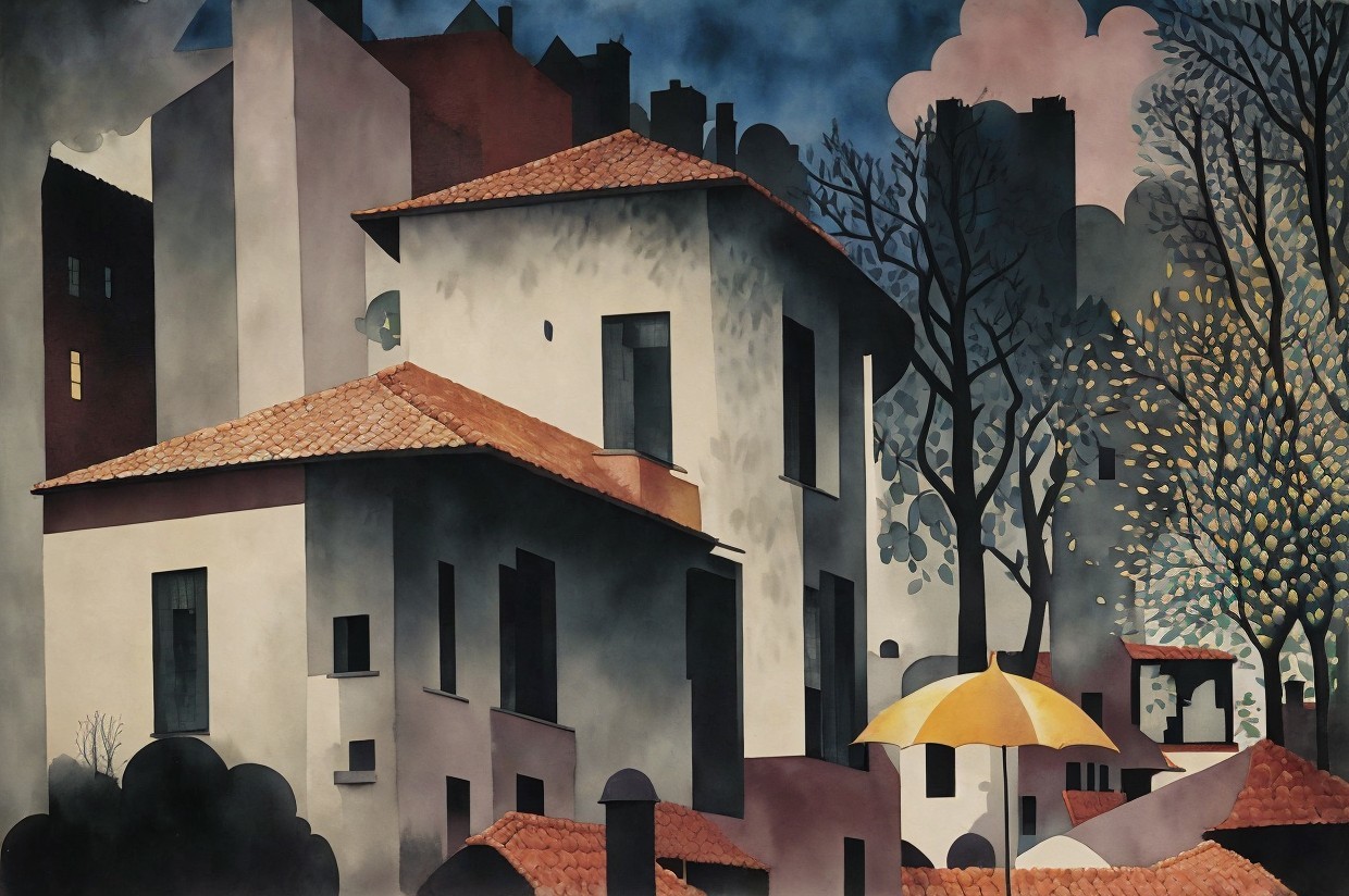 A watercolor painting of a quaint village with buildings, trees, and a solitary figure holding an umbrella. From my own images.