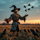 Scarecrow in Patterned Coat Surrounded by Crows at Sunset