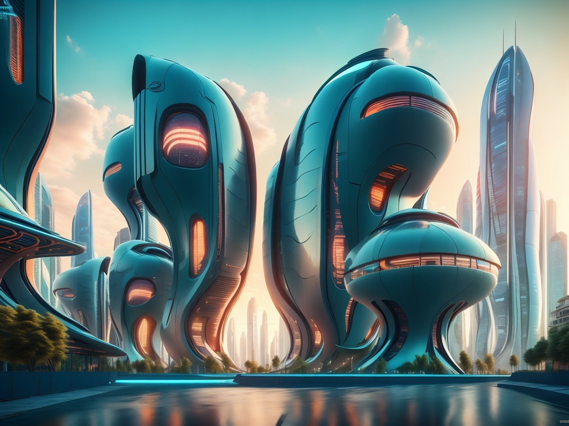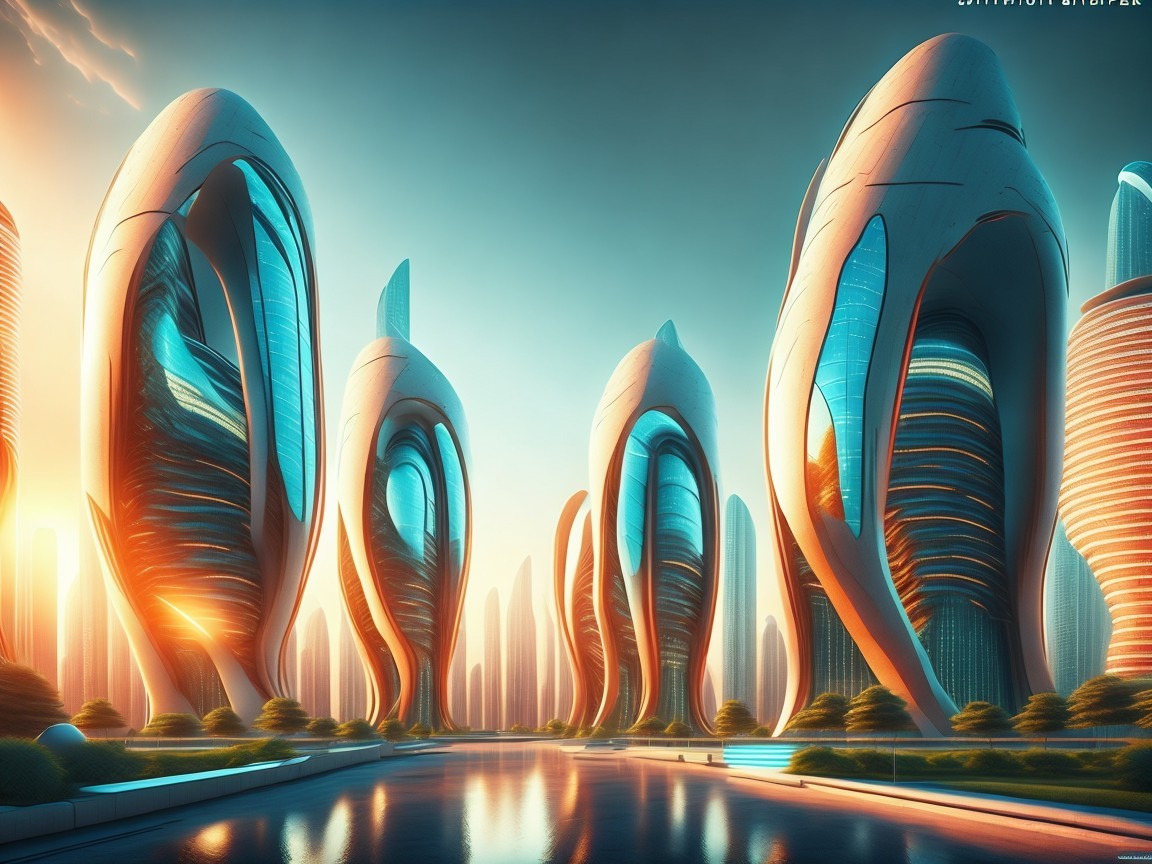 A futuristic cityscape featuring sleek, curvilinear skyscrapers with glowing elements. A tranquil river flows nearby, reflecting the unique architecture against a soft twilight sky.