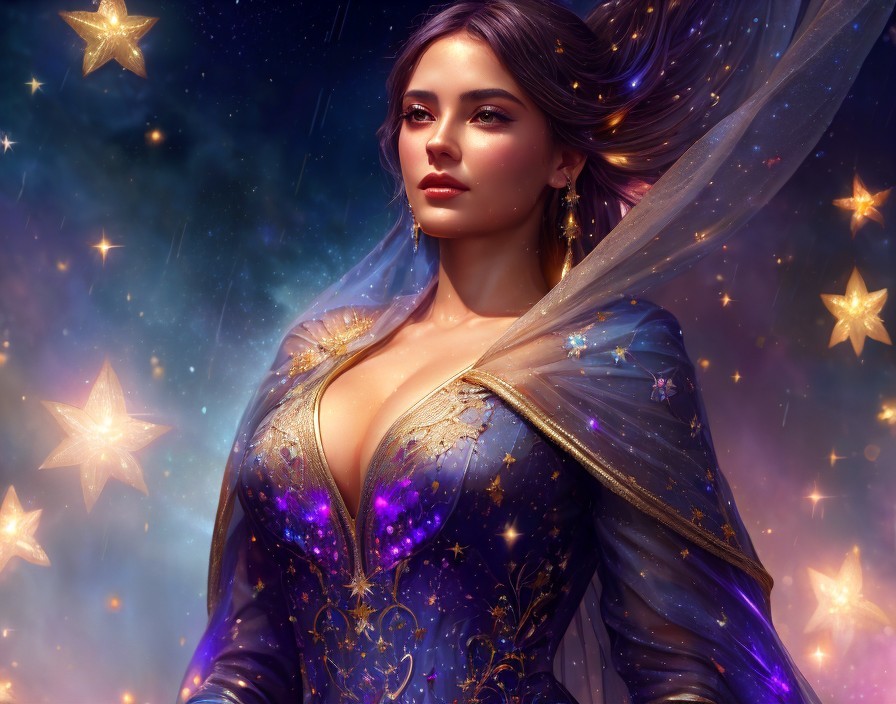 A beautiful woman standing in the rain of stars. She wears a long dress made of thin fabric with gold findings.