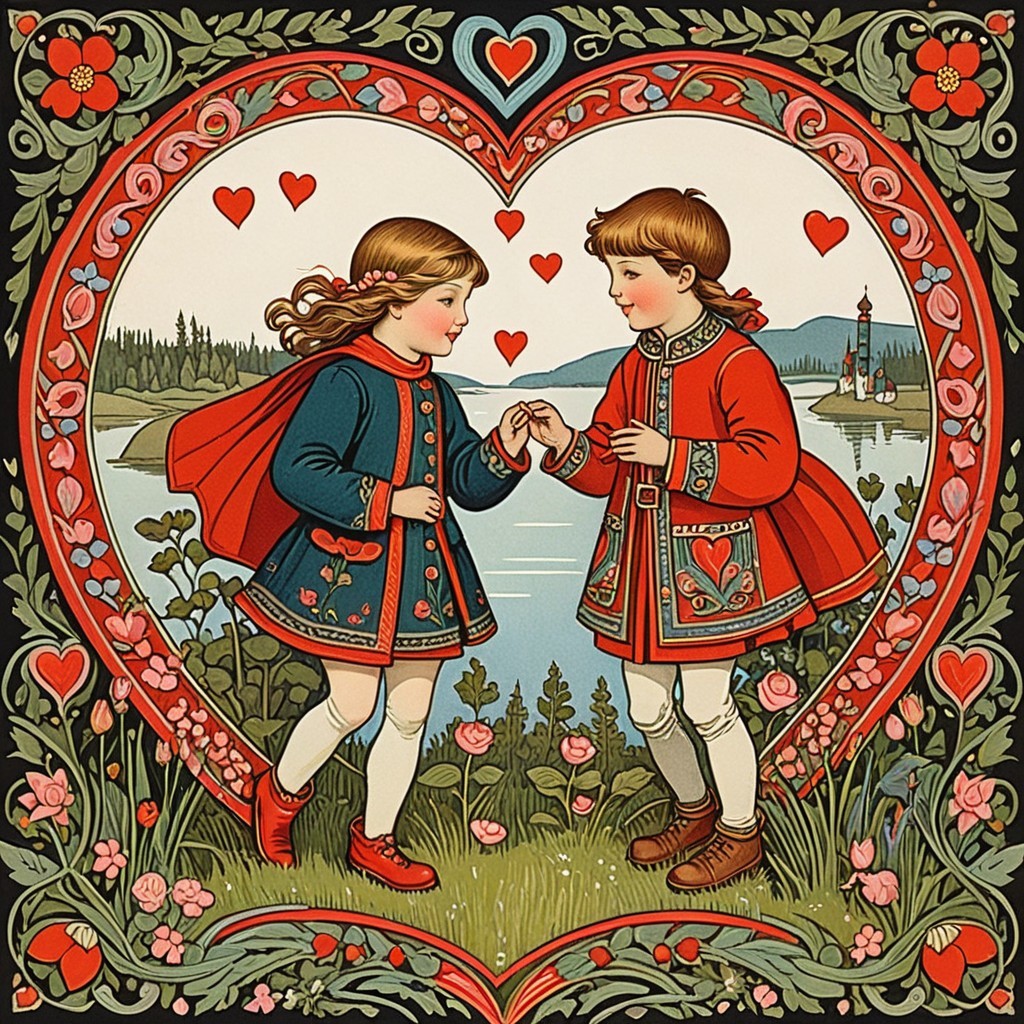 A whimsical digital painting in the style of folk art and medieval illuminations, featuring two young children, a boy and a girl, holding hands within a heart-shaped border. The border is intricately decorated with red and pink floral motifs, green leaves, and small red hearts, all set against a black