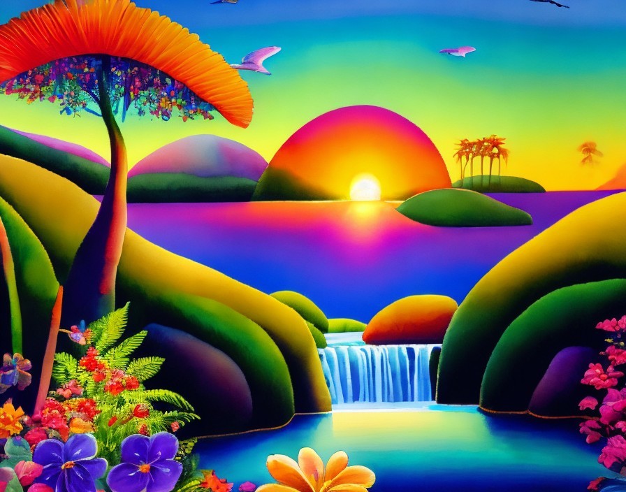 Full page, single image, spectacular sunrise, rainforest, stream, tropical flowers, 3D watercolor patchwork, by Peter Max, with elements of Jan Toorop style