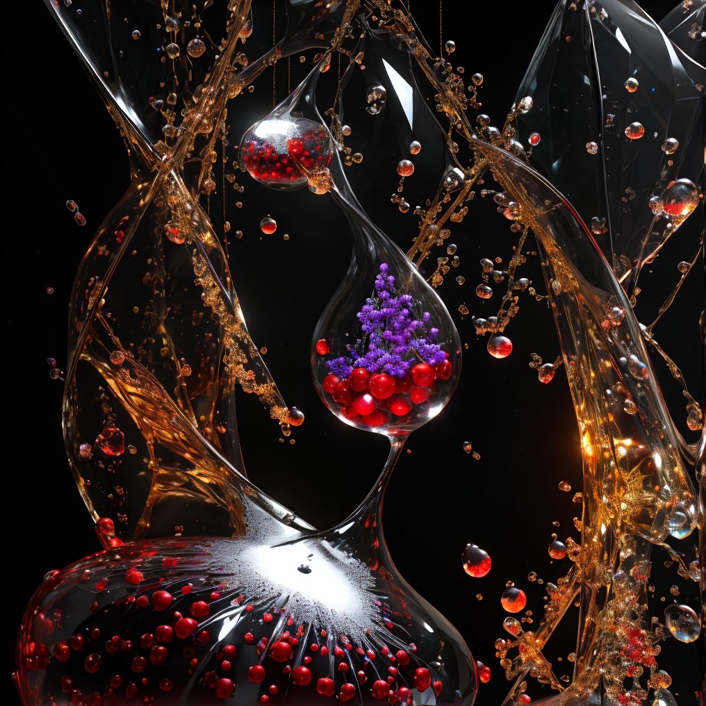 Transparent and Reflective Liquid Streams with Red and Purple Spheres