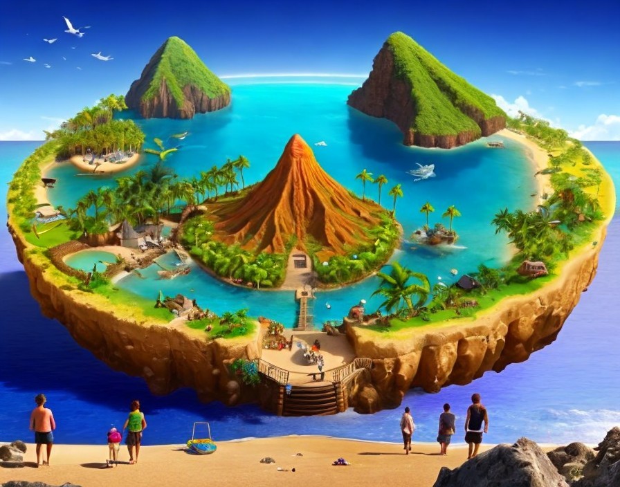 A vibrant, fantasy island floating in the sky, with people gazing at its tropical landscape, crystal waters, and whimsical mountains.