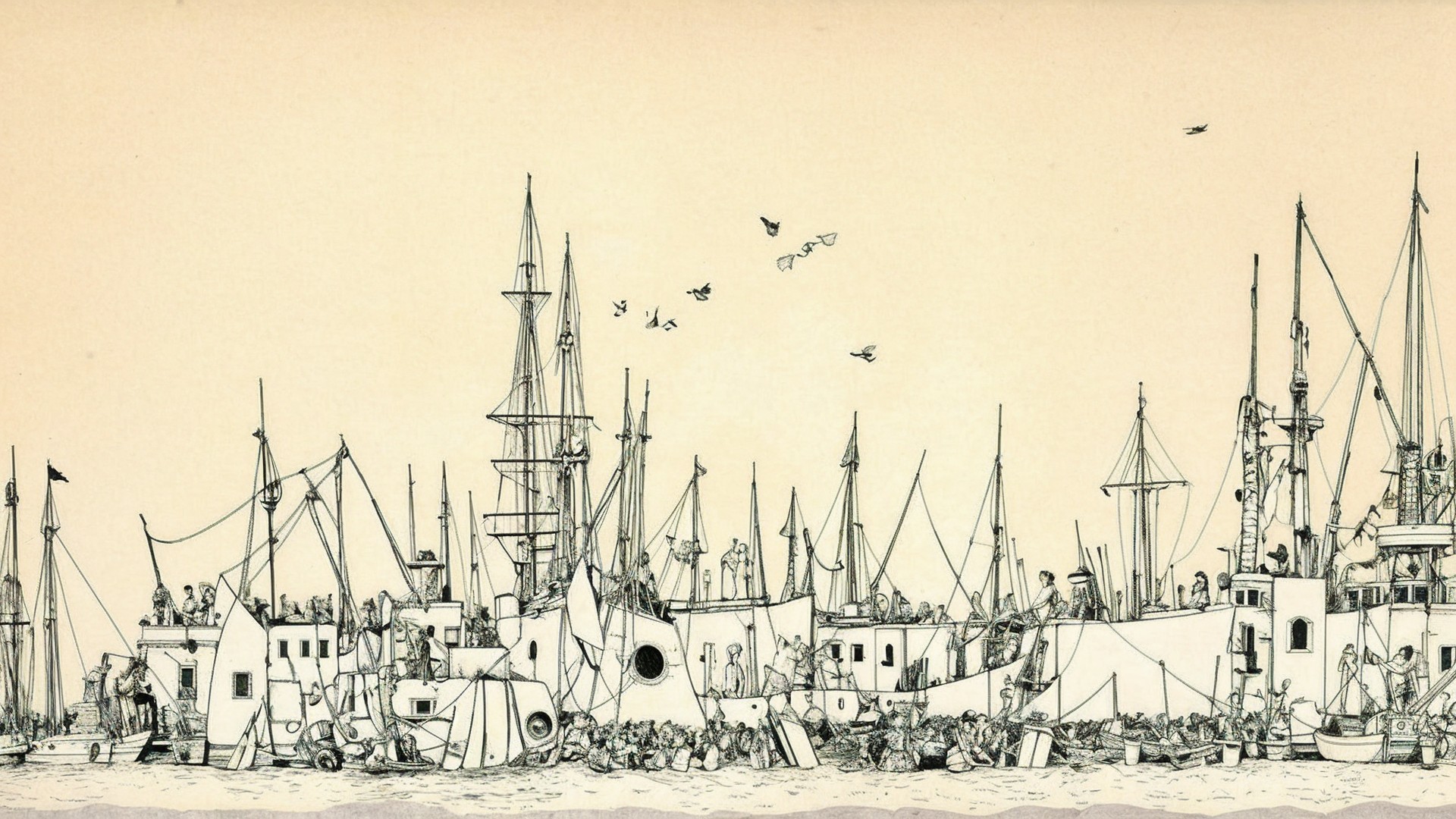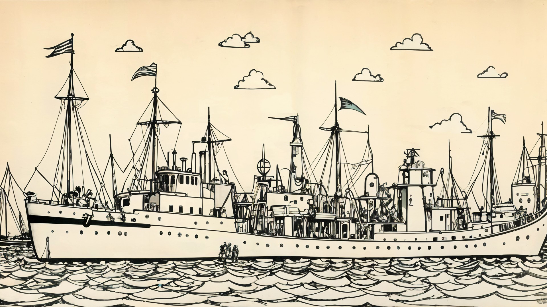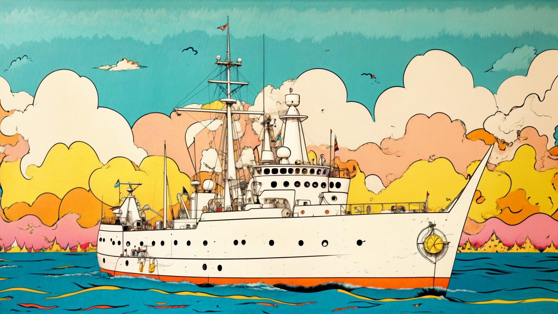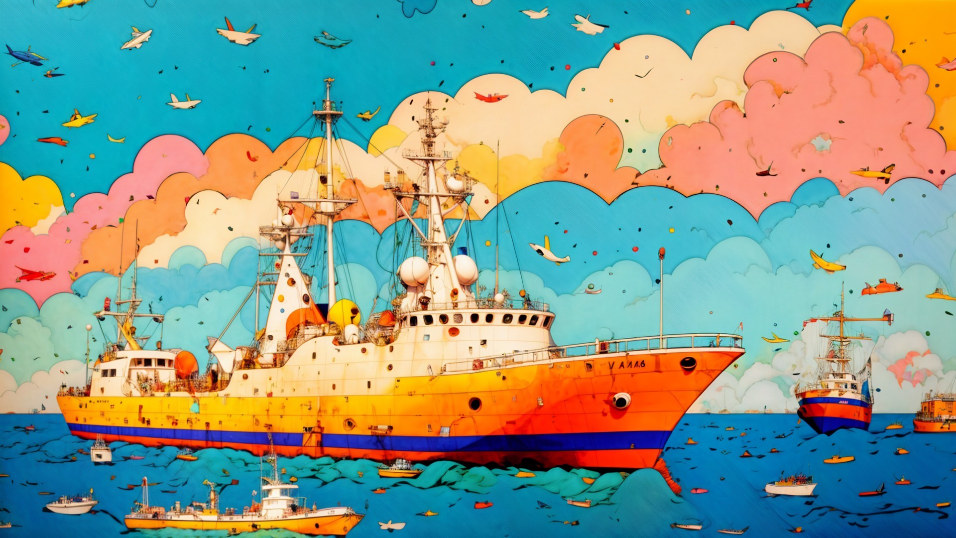 A vibrant, stylized scene featuring a large fishing boat surrounded by colorful clouds and smaller boats. The palette is bright and playful, with bold shapes and patterns enhancing the whimsical atmosphere.
