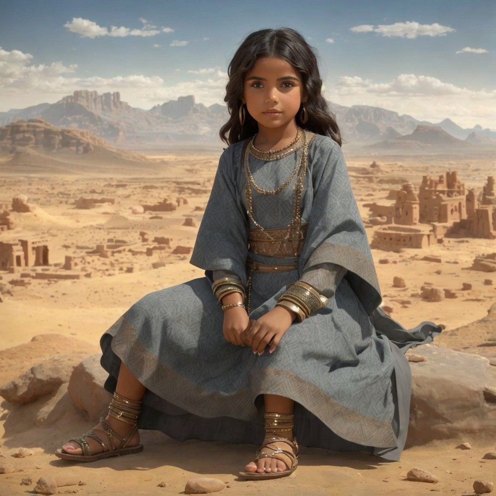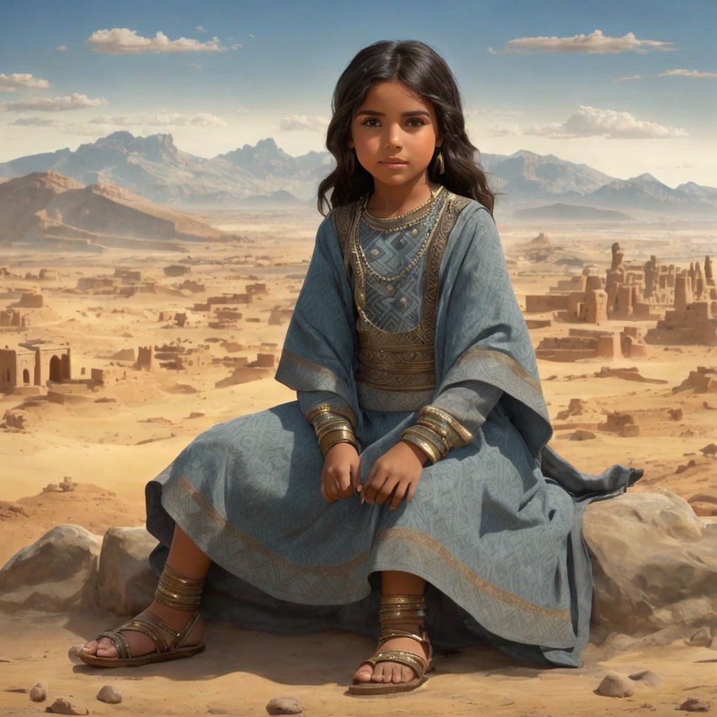 Prompt: A scene from the Bronze Age. A full body representation A girl (aged 7) with a desert and mountains on the horizon in the background. She has dark hair and olive-colored skin. She is dressed in an ankle-length, gray-blue patterned garment in the North African style.