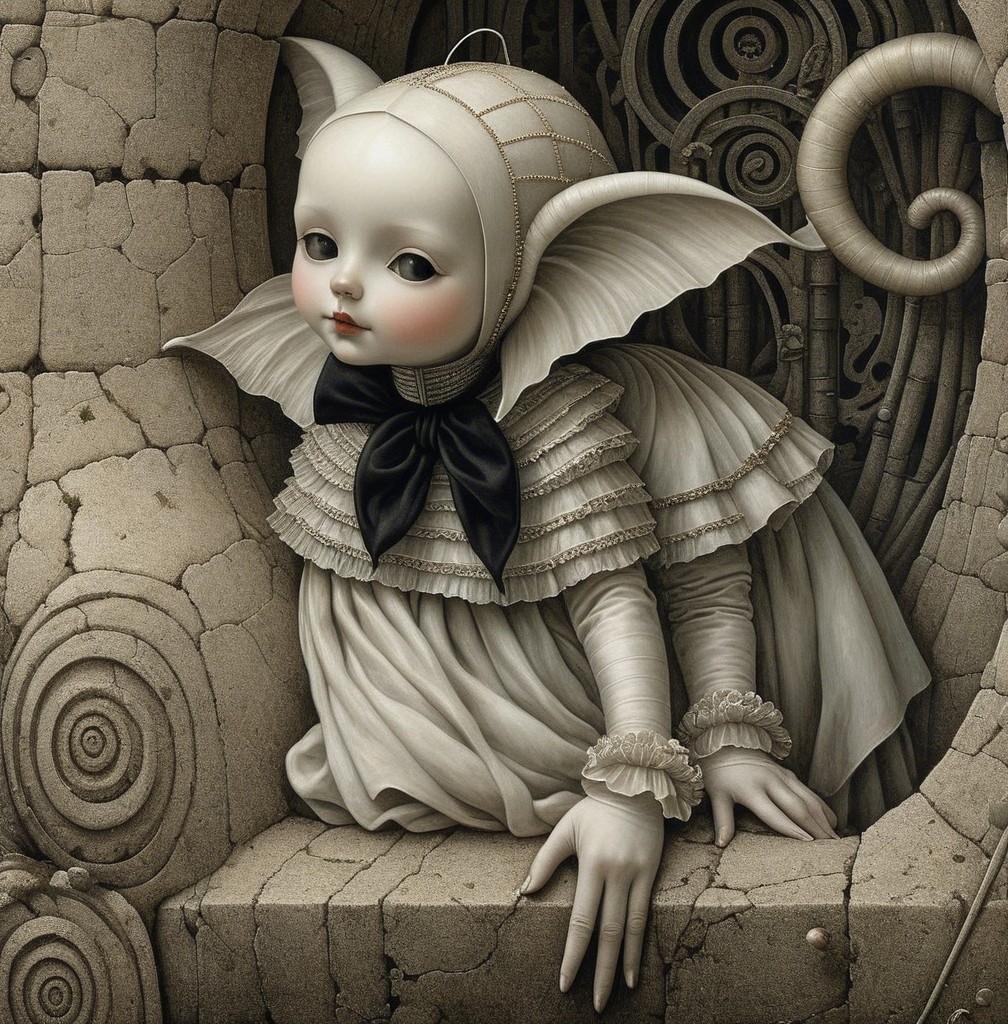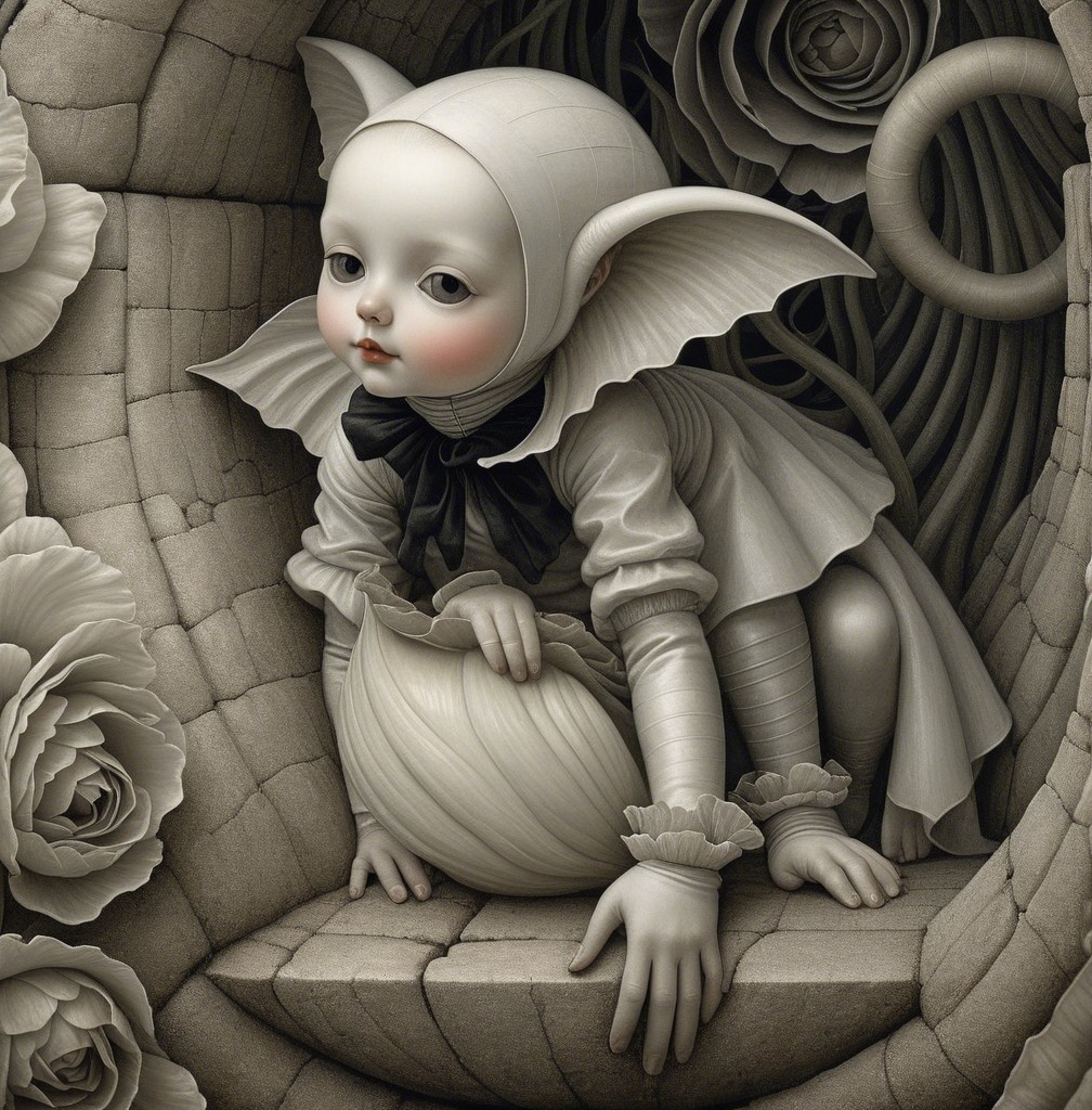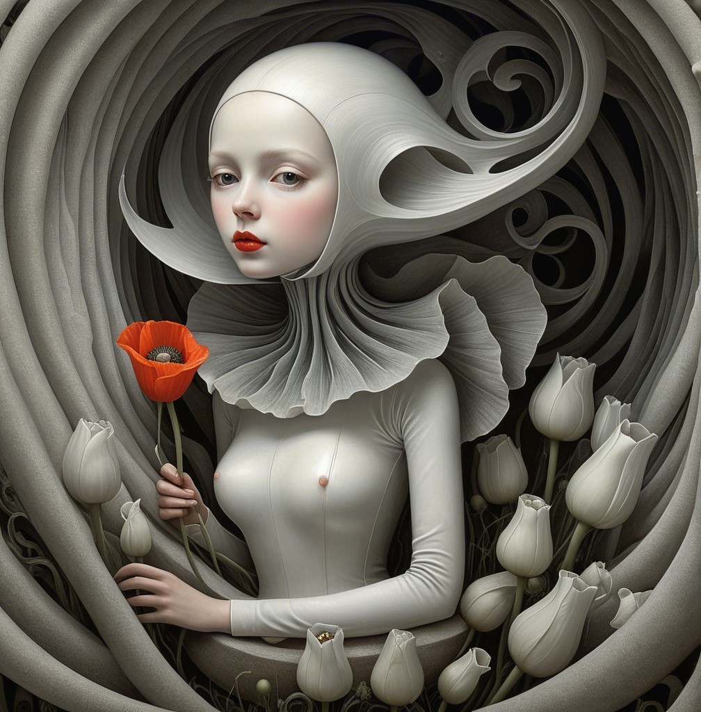 A futuristic female figure with metallic features emerges from a spiral rose, holding a vibrant red poppy. The contrast of organic and artificial forms creates a captivating visual harmony.