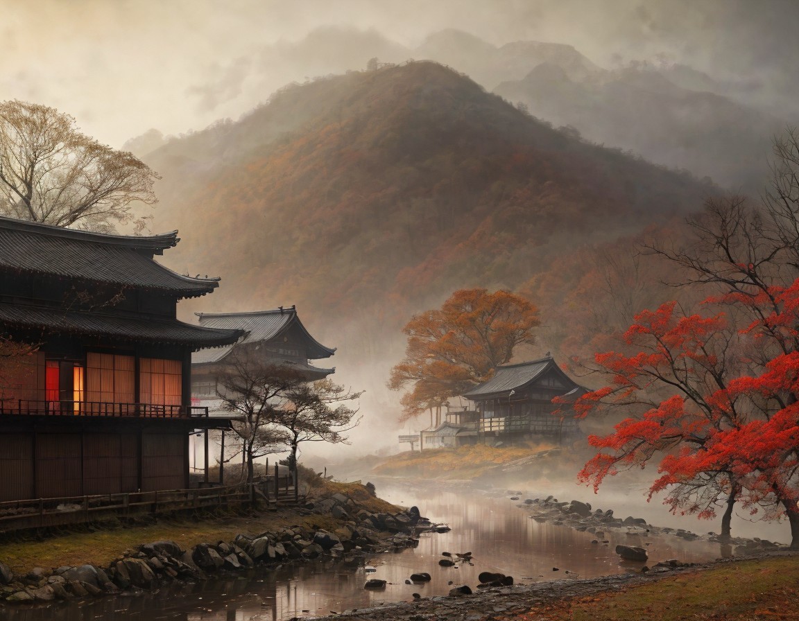Prompt: "Oppressive rural landscape, early 20th century, Japan, by Liu Maoshan and John Atkinson Grimshaw, late autumn, watercolor, wet brush effect, intricate, epic, panoramic wide view"