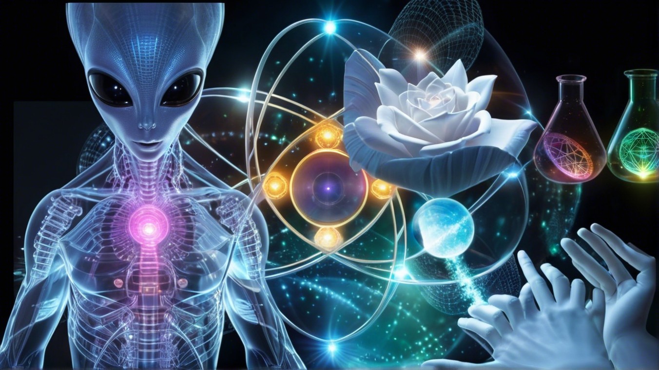 A futuristic scene features a transparent alien and a human woman interacting with glowing holographic displays, showcasing advanced technology and a sense of collaboration between species.