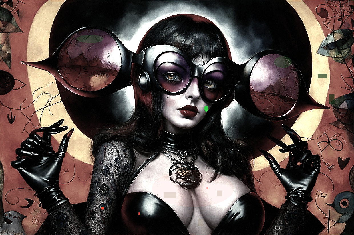 A striking figure with long black hair and dramatic makeup wears oversized, round glasses. Dressed in a sleek black outfit, she exudes a mysterious, alluring vibe against a surreal, colorful background.