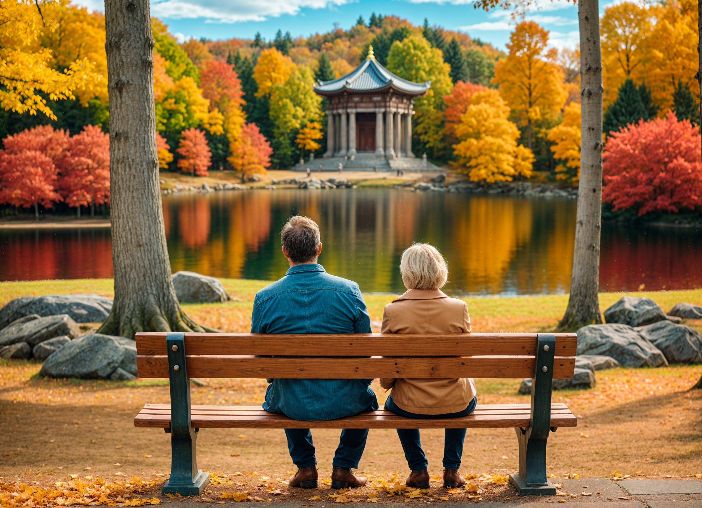 A serene autumn scene shows a couple sitting on a bench by a tranquil lake, surrounded by vibrant fall foliage and a traditional structure reflecting in the water.