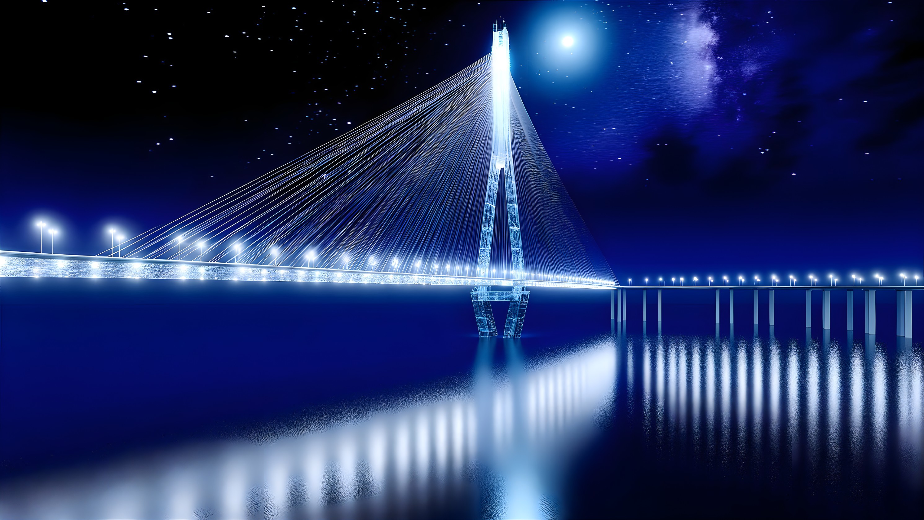 A stunning crystal cable-stayed bridge stretches gracefully over an abyss, illuminated by moonlight. Its intricate design and ethereal glow create a captivating, futuristic scene under a starry sky.