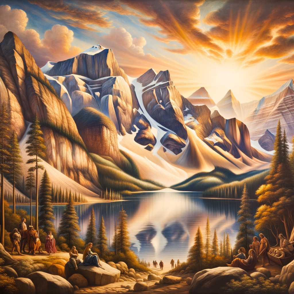 The image depicts a serene landscape of majestic mountains reflecting in a tranquil lake, under a dramatic sky filled with clouds and sunlight, showcasing vibrant autumn foliage.