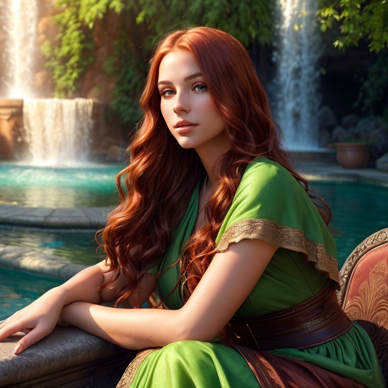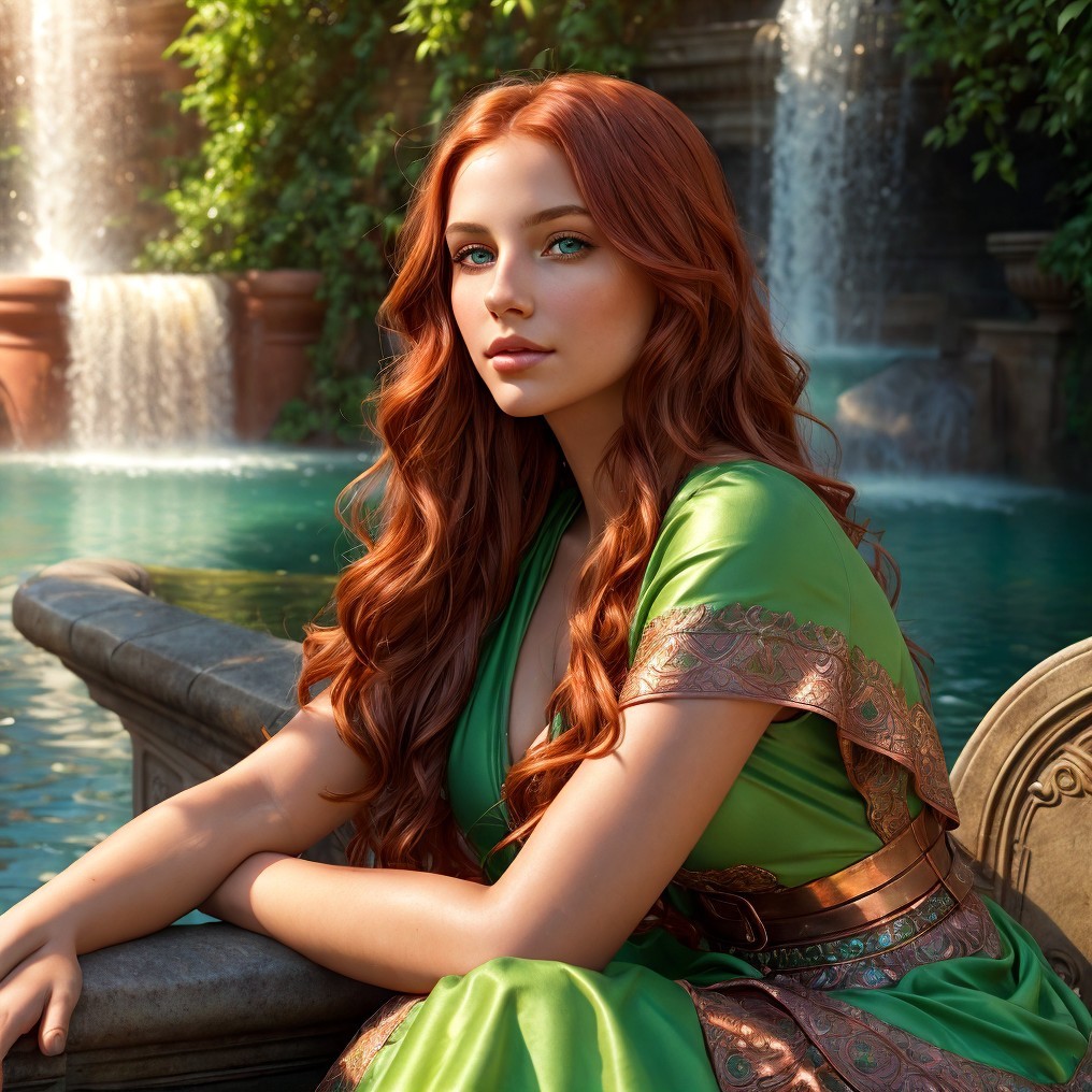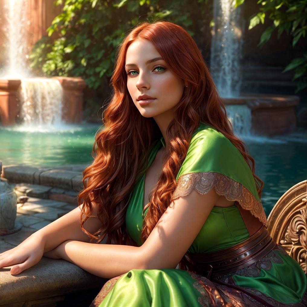 A woman with red hair and a green dress sits by a fountain with waterfalls in the background.