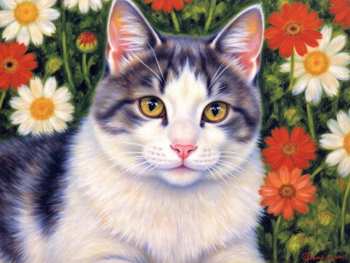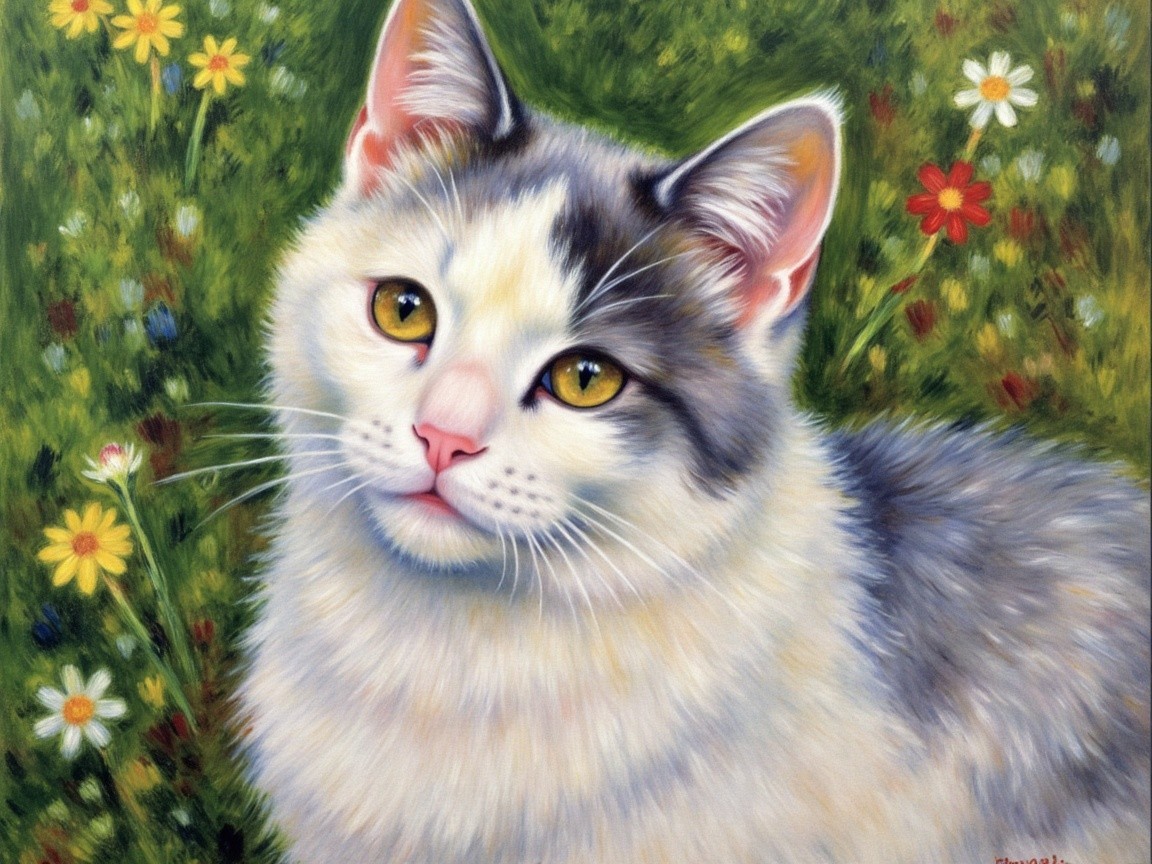 A fluffy cat with striking yellow eyes gazes gently at the viewer, surrounded by vibrant greenery and colorful flowers, creating a cheerful and enchanting atmosphere.