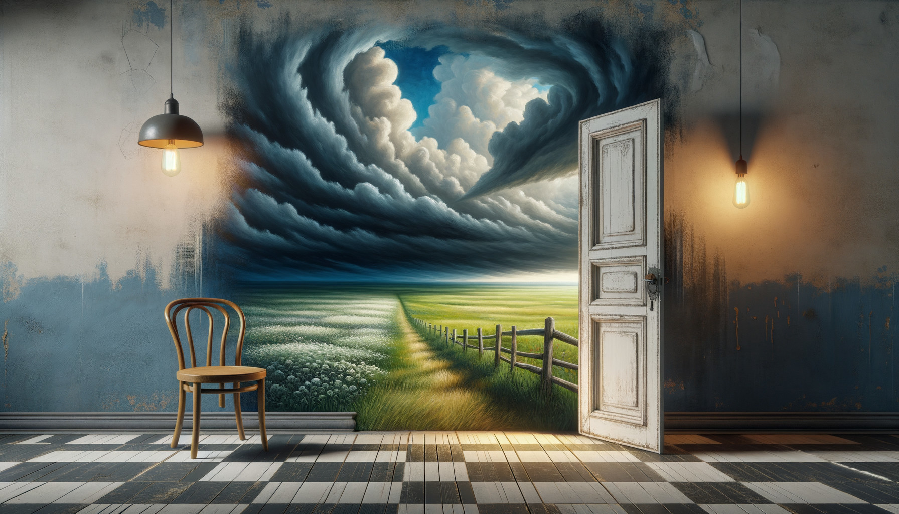 A surreal room opens onto a vast landscape under a dramatic sky, with a path leading to the horizon, blending indoor calm with outdoor intensity.