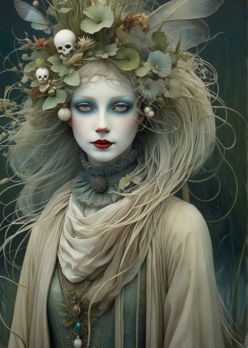 Close up, impish devious beautiful Pierrot creature in a magical wetland marsh maze, in the style of Alexander Jansson. by Catrin Welz-Stein, Michael Parkes